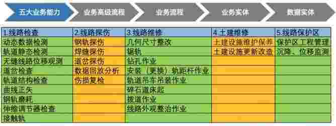 在轨道运维业务中,,,,,,,,,,,,,,我们形成了完整的从业务能力(业务域)-业务流程-业务实体-数据模型的分析梳理过程。。。。轨道运维业务能力如下图所示::::::